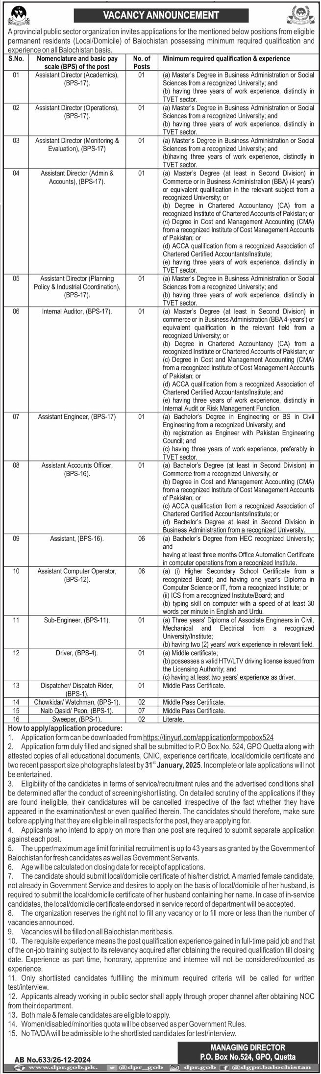 Public Sector Organization jobs advertisement dated about 28 December 2024 in daily Other Newspaper invites application for the vacant post of dispatcher, assistant director planning policy, assistant, assistant accounts officer, driver, assistant director operations, assistant director monitoring, assistant computer operator, internal auditor, peon, naib qasid, assistant director evaluation, assistant director admin, dispatch rider, assistant director accounts, assistant director academics, assistant engineer, chowkidar, ltv driver, sweeper, watchman, sub engineer, assistant director, htv driver and assistant director industrial coordination in Quetta, quetta Balochistan Pakistan. Educational qualifications required Master, Intermediate, Primary, ACCA, Matric, DAE, MBA, B.E, B.com, Bachelor, BBA, Middle, M.com, CA and BA etc.