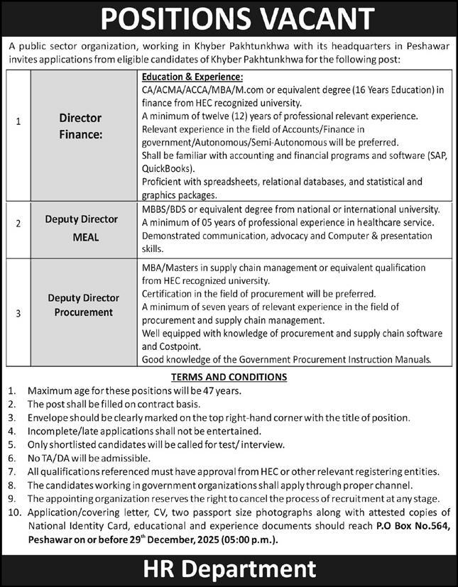 Public Sector Organization jobs advertisement dated about 13 December 2025 in daily Express Newspaper invites application for the vacant post of deputy director procurement, deputy director meal and director finance in Peshawar, peshawar Khyber Pakhtunkhwa KPK Pakistan. Educational qualifications required MBBS, BDS, MBA, Master, M.com, Others, CA and ACCA etc.