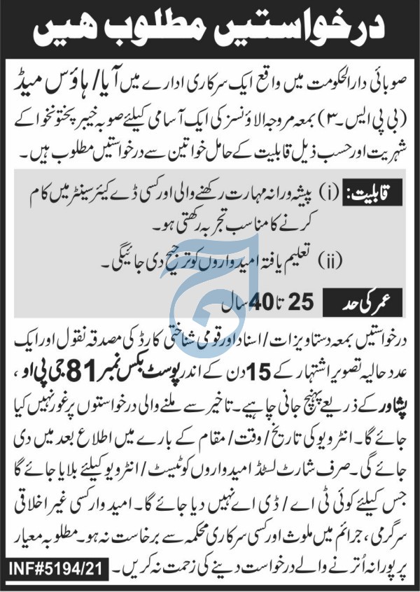 P O Box No 81 GPO Peshawar Jobs 2021 for House Maid