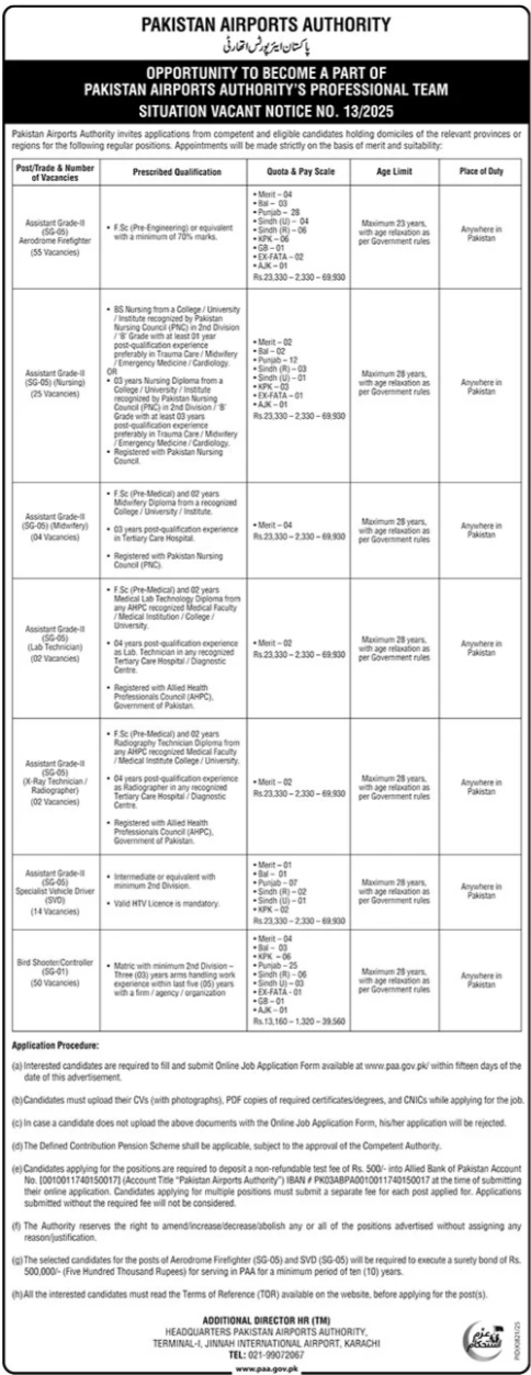 Pakistan Airports Authority PAA jobs advertisement dated about 9 September 2025 in daily The News Newspaper invites application for the vacant post of assistant grade ii, specialist vehicle driver, assistant, bird controller, radiographer, assistant nursing, assistant midwifery, lab technician, aerodrome fire fighter, htv driver, bird shooter and x ray technician in Airport Karachi, karachi Sindh Pakistan. Preferred Education is Intermediate, Others, Matric and DAE etc.