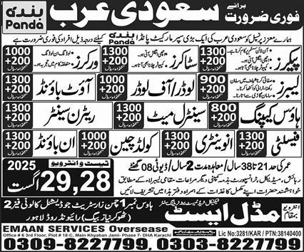Vacant posts including loader, central mate, facility, stocker, cold chain, out bound, in bound, house keeping, packer, inventory, worker, labor, off loader and return center are announced in Emaan Services Overseas Employment Promoters Riyadh, riyadh Saudi Arabia as per 24 August 2025 advertisement in daily Express Newspaper. Candidates with Matric and Middle etc. educational background will be preferred.