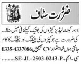 Boutique Cantt Lahore, lahore Punjab Pakistan invites applications from eligible candidates for the post of packing worker and checker as per advertisement of March 11, 2025 published in daily Jang Newspaper. Persons with Matric and Intermediate etc. education can apply.