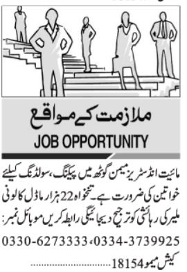 Packing Worker & Soldering Worker Jobs 2022 in Karachi