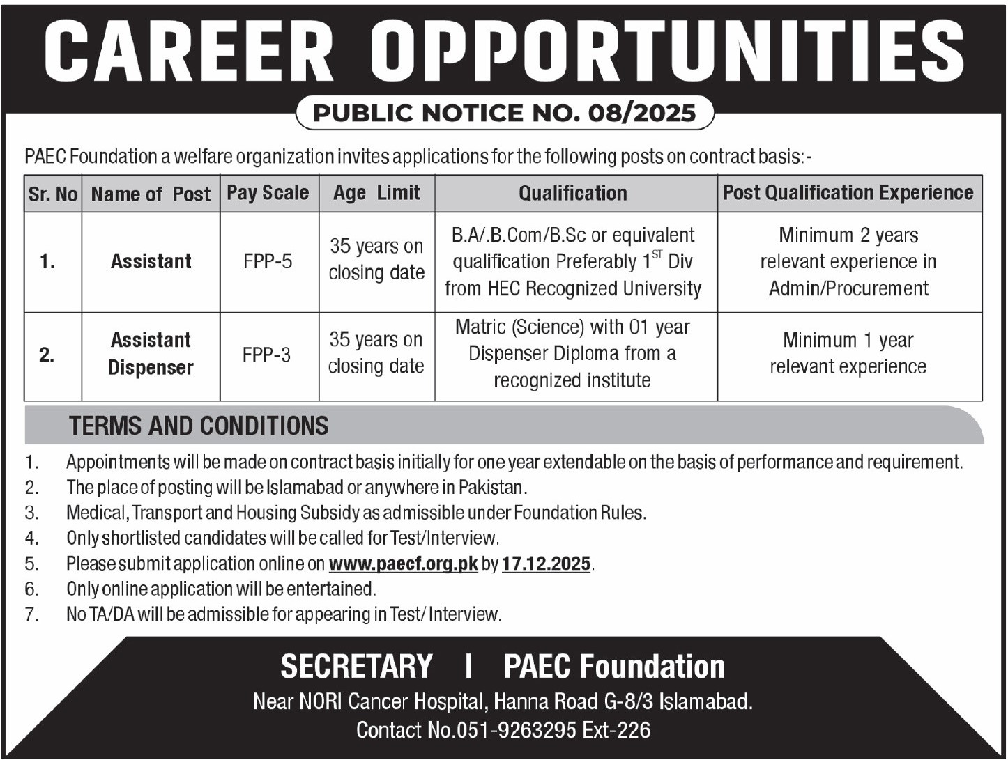 Latest Management jobs and others Government jobs in Paec Foundation closing date is around December 17, 2025, see exact from ad. Read complete ad online to know how to apply on latest Paec Foundation job opportunities.
