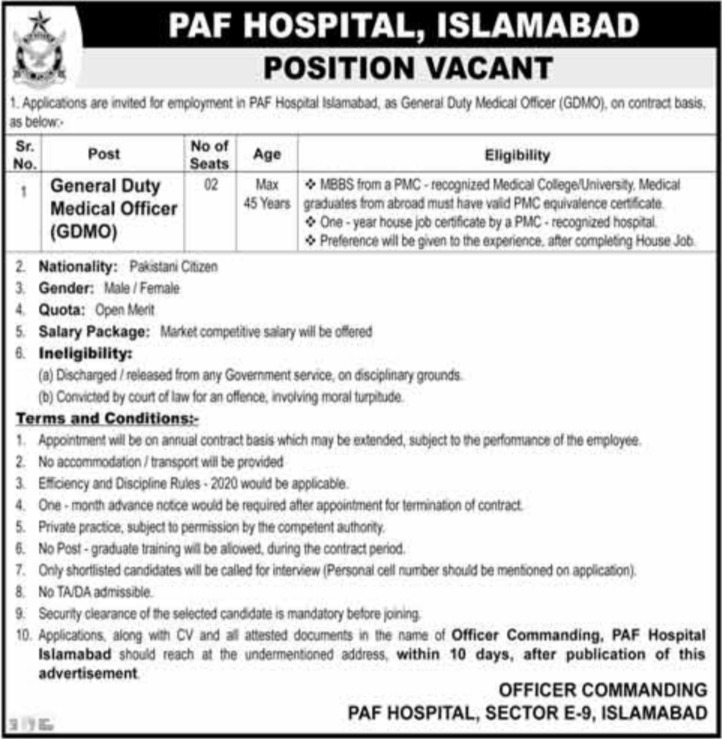 PAF Hospital Islamabad, islamabad Islamabad Pakistan invites applications from eligible candidates for the post of general duty medical officer as per advertisement of March 20, 2022 published in daily Dunya Newspaper. Candidates with MBBS etc. educational background will be preferred.