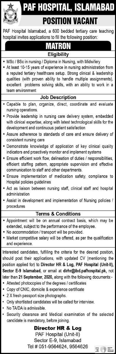 PAF Hospital Jobs 2020 For Matron In Islamabad