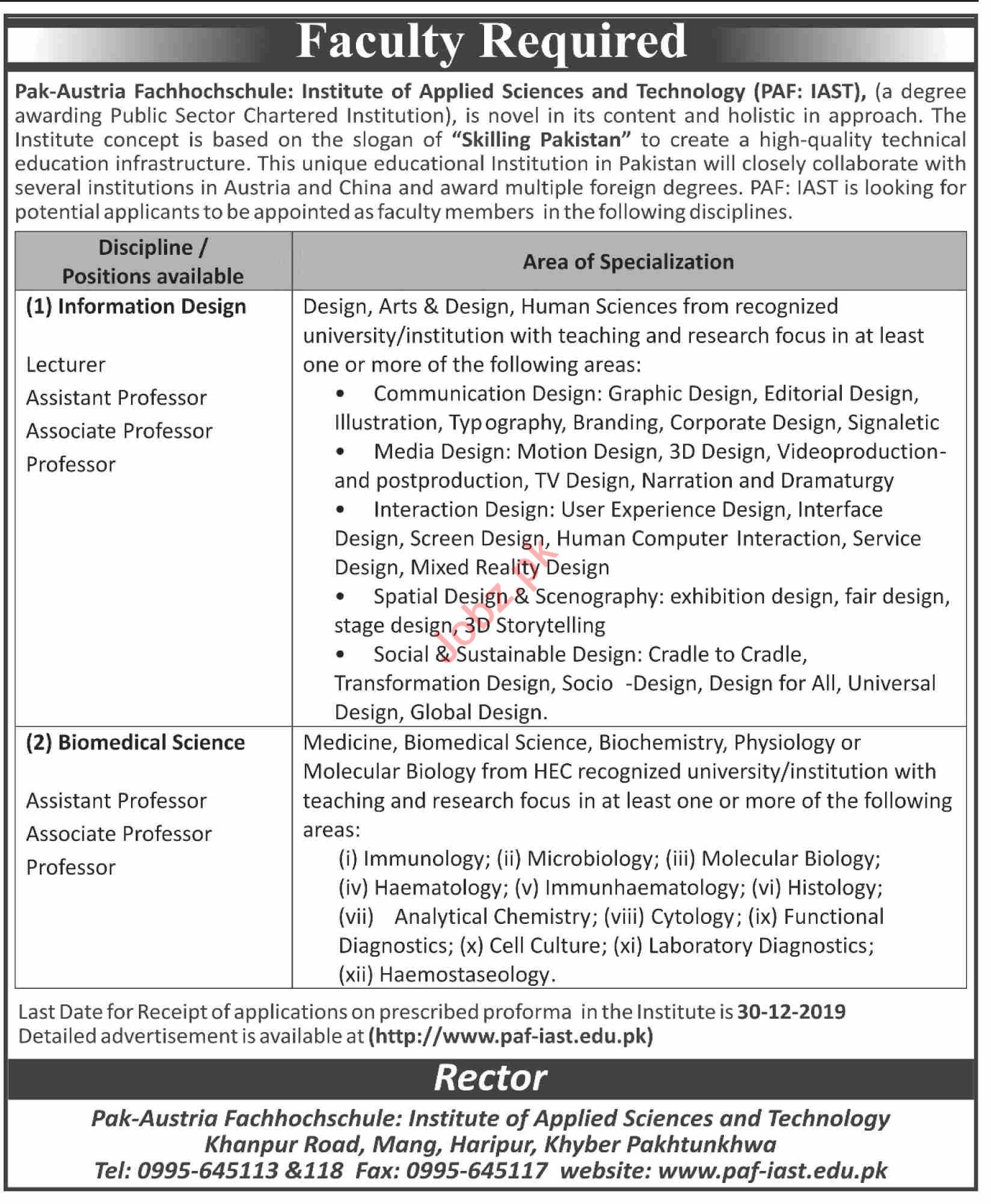 Pak Austria Fachhochschule Institute of Applied Sciences and Technology PAF IAST Haripur, Pakistan seeks candidates for the posts of Professor, Associate Professor, Assistant Professor, Lecturer, Professor Information Design, Professor Biomedical Science, Professor Communication Design, Professor Graphic Design, Professor Media Design, Professor 3D Design, Professor Immunology, Professor Microbiology, Professor Molecular Biology, Professor Haematology, Professor Histology, Professor Analytical Chemistry, Professor Cytology, Professor Functional Diagnostics, Professor Cell Culture.