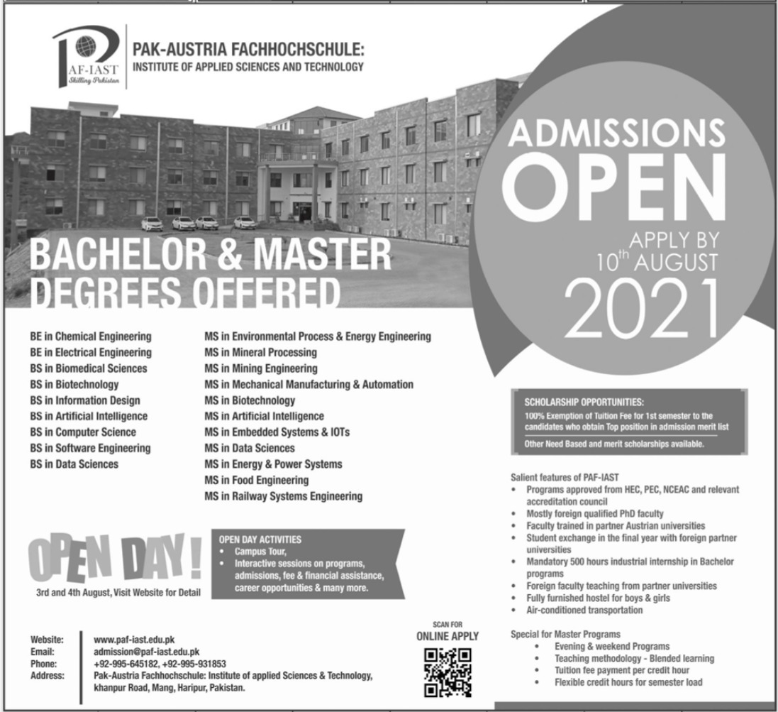 Pak Austria Fachhochschule Institute of Applied Sciences & Technology invites applications for admissions in Bachelor & Master Degrees in Haripur KPK 2021. Read newspaper ad for exact details.