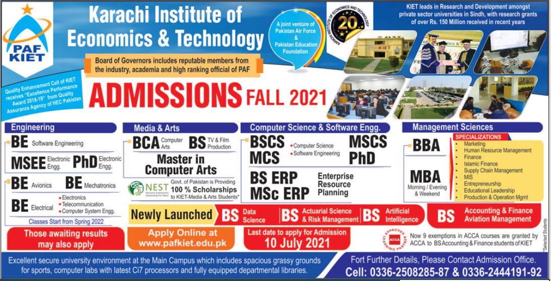 PAF KIET Karachi Institute of Economics & Technology invites applications for online admissions in BE, MSEE, PhD, BCA, BS, MA, BSCS, MSCS, MCS, BBA and MBA degree programs 2021. Read newspaper ad for exact details.