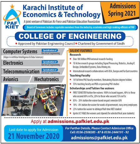 Pakistan Air Force PAF KIET Karachi Institute of Economics & Technology invited applications for admissions in Computer Systems Engineering Technology, Electronics Engineering Technology, Telecommunication Engineering Technology, Avionics Engineering Technology and Mechatronics Engineering Technology. Read newspaper ad for exact details.