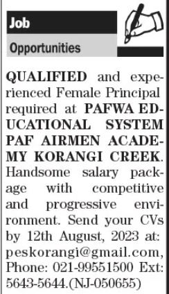 PAFWA Educational System PAC Karachi, karachi Sindh Pakistan invites applications from eligible candidates for the post of female principal and principal as per advertisement of August 9, 2023 published in daily The News Newspaper. Candidates with Master etc. educational background will be preferred.