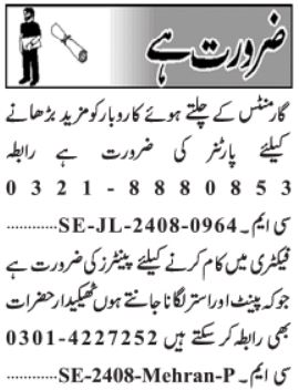 Private Company jobs advertisement dated about 29 August 2024 in daily Jang Newspaper invites application for the vacant post of painter and investor in Lahore, lahore Punjab Pakistan. Matric, Primary and Middle etc. educational qualification will be preferred.