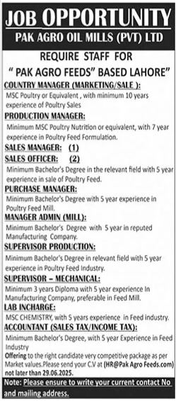 Pak Agro Oil Mills Pvt Ltd is looking for candidates for following posts as per job advertisement published in daily The News Newspaper of June 16, 2025 for location Lahore, lahore Punjab Pakistan: