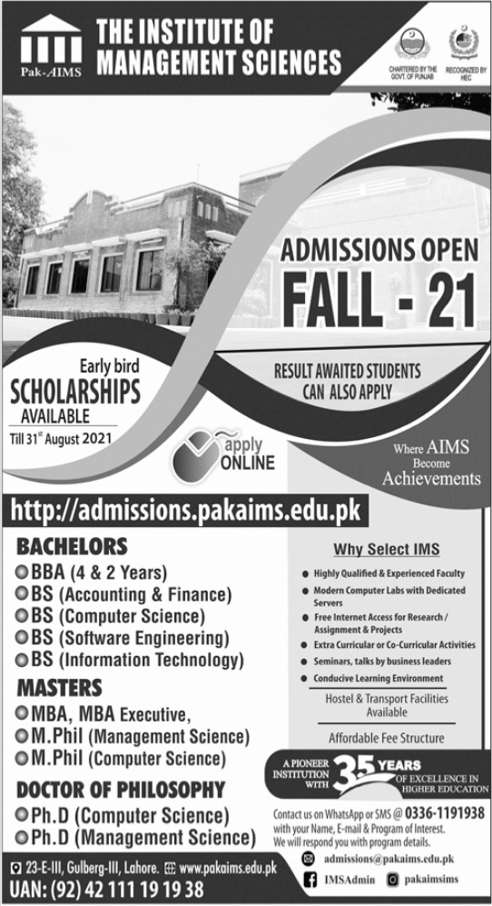 PAK AIMS Institute of Management Sciences invites applications for admissions in Bachelors, Masters, BBA, BS, MBA, EMBA, M.Phil and PhD degree programs 2021. Read newspaper ad for exact details.