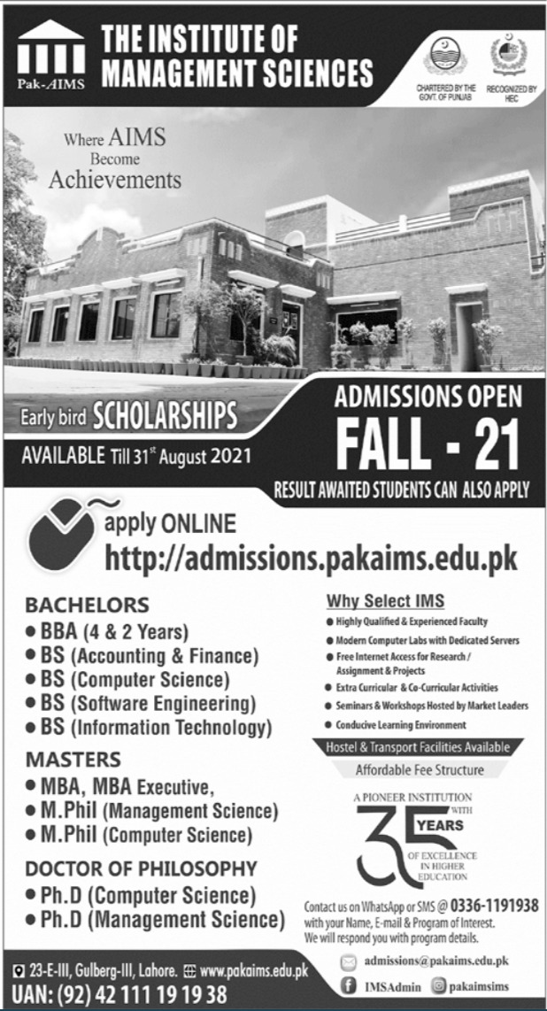 PAK AIMS Institute of Management Sciences invites applications for admissions in Bachelors, BBA, BS, Masters, MBA, MBA Executive, M.Phil and PhD Degree Programs 2021. Read newspaper ad for exact details.