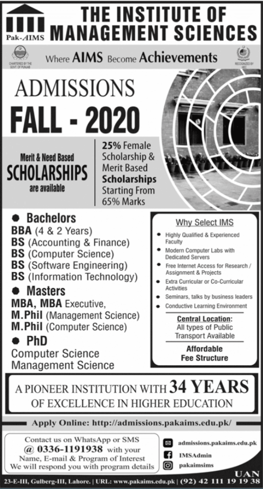 Pak-AIMS The Institute of Management Sciences is offering admissions in Bachelors, Masters, BBA, BS, MBA, MBA Executive, M.Phil, PhD Degree Programs in Lahore. Read newspaper ad for exact details.