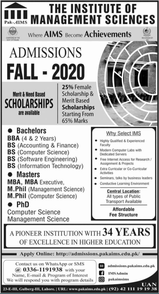 Pak-AIMS The Institute of Management Sciences has announced admissions in Bachelors, Masters, BBA, BS, MBA, MBA Executive, M.Phil, PhD Degree Programs in Lahore. Read newspaper ad for exact details.
