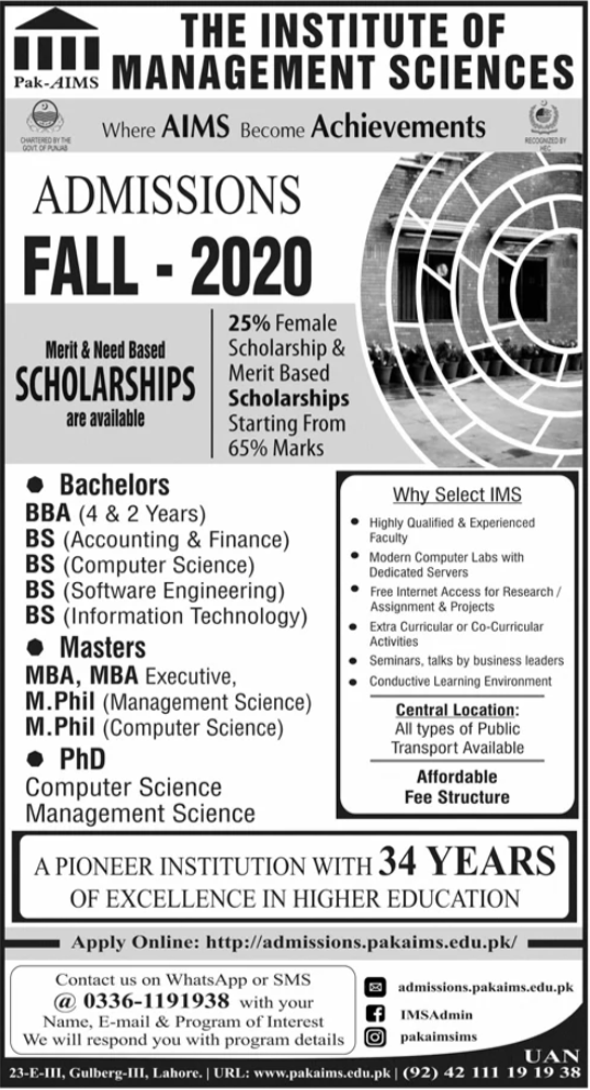 Pak-AIMS The Institute of Management Sciences invited applications for Bachelors, BBA, BS, Masters, MBA, EMBA, M.Phil, PhD Computer Science & PhD Management Science in Lahore. Read newspaper ad for exact details.