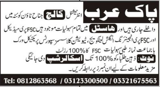 Pak Arab International College is a private college system has announced admissions in FSc Pre Engineering and FSc Pre Medical in Quetta Balochistan 2021. Read newspaper ad for exact details.