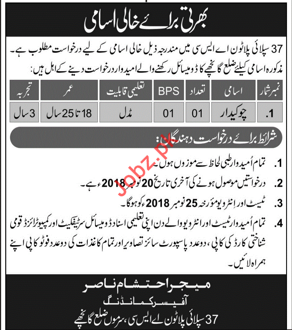 Pak Army 261 Supply Platoon ASC Chowkidar Jobs 2018