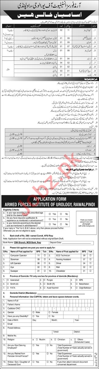 Armed Forces Institute of Urology AFIU Rawalpindi, Pakistan Army, Government of Pakistan is looking candidates for the posts of Computer Operator, ECG Technician, Storeman, Nursing Assistant, Lift Operator, Driver, LTV Driver, Aya, Mali, Sweeper, Female Sweeper, Chowkidar.