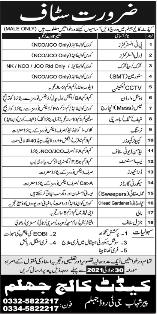 Pakistan Army Cadet College Jhelum is looking for qualified, experienced and technical candidates for the posts of PT Instructor, Drill Instructor, Clerk, Head Clerk, Store Man, CCTV Technician, Hostel Warden, Mess Incharge, Chef, Cook, Nurse, Computer Composer, Admin Officer, Lab Assistant, Driver, Security Guard, Sweeper, Head Gardener, Mali, Electrician, Imam Masjid, Labor, Barber, Mason and Dhobi.