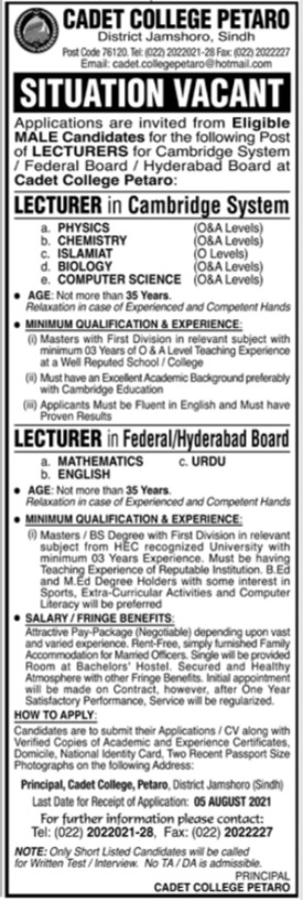 Pakistan Army Cadet College Petaro is seeking applications from qualified and experienced candidates for the posts of Physics Lecturer, Chemistry Lecturer, Islamiat Lecturer, Biology Lecturer, Computer Science Lecturer, Mathematics Lecturer, Urdu Lecturer and English Lecturer in District Jamshoro.