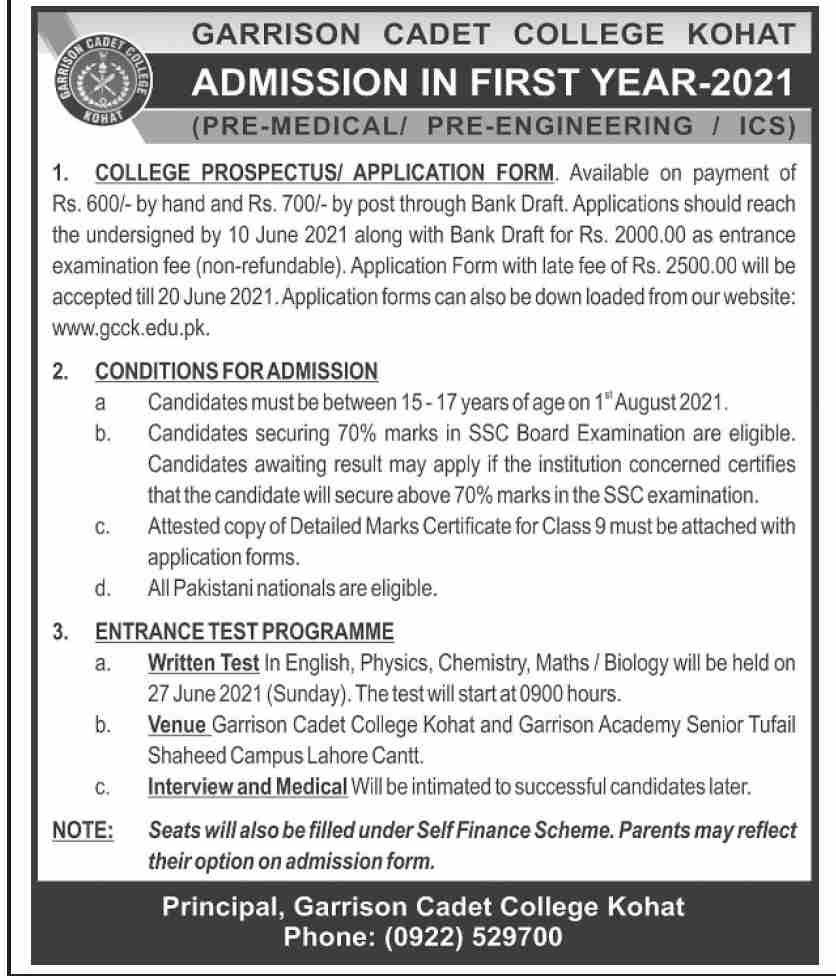 Pakistan Army Garrison Cadet College invites applications for admissions in Intermediate, FSc Pre Medical, FSc Pre Engineering and ICS in Kohat Khyber Pakhtunkhwa KPK 2021. Read newspaper ad for exact details.
