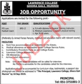Vacancies in Lawrence College Ghora Gali Advertisement September 2019