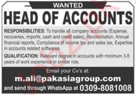 Pak Asia Group jobs advertisement dated about 16 June 2024 in daily Jang Newspaper invites application for the vacant post of head of accounts in Lahore, lahore Punjab Pakistan. Candidates with Master and Bachelor etc. educational background will be preferred.