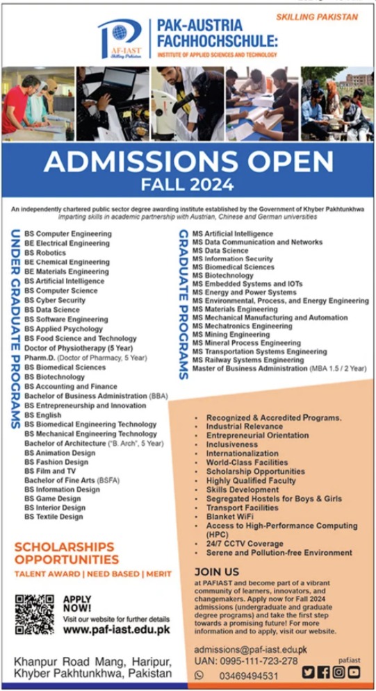 Pak Austria Fachhochschule Institute of Applied Sciences & Technology has announced admissions 2024 for Computer Engineering, Electrical Engineering, Robotics, Chemical Engineering, Materials Engineering, Artificial Intelligence, Computer Science, Cyber Security, Data Science, Software Engineering, Applied Psychology, Food Science & Technology, Doctor of Physiotherapy, Biomedical Sciences, Biotechnology, Accounting & Finance, English, Biomedical Engineering Technology, Mechanical Engineering Technology, Animation Design. Eligible students can apply for academic admissions 2024 in Pak Austria Fachhochschule Institute of Applied Sciences & Technology Haripur Khyber Pakhtunkhwa KPK Pakistan for Teaching University. Eligible students for fulfilling criteria for admissions in BS, DPT, MBA, B.E, BBA, Pharm D and MS can enroll as per Government admission policy 2024 till closing date 4 July 2024. Read newspaper ad for exact details.