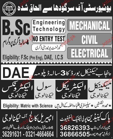 Pak Canadian Polytechnic Institute Admission in DAE in Lahore. Read newspaper ad for exact details.