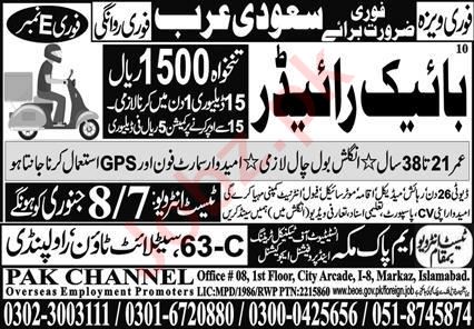Pak Channel Overseas Employment Promoters jobs advertisement dated about 8 January 2024 in daily Express Newspaper invites application for the vacant post of bike rider in Riyadh, riyadh Saudi Arabia. Candidates with Middle, Matric and Primary etc. educational background will be preferred.