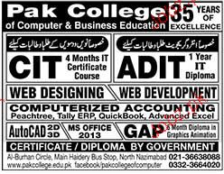 Pak College Admission in CIT and ADIT in Karachi. Read newspaper ad for exact details.
