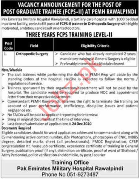 Vacancies in Pak Emirates Military Hospital Advertisement December 2020