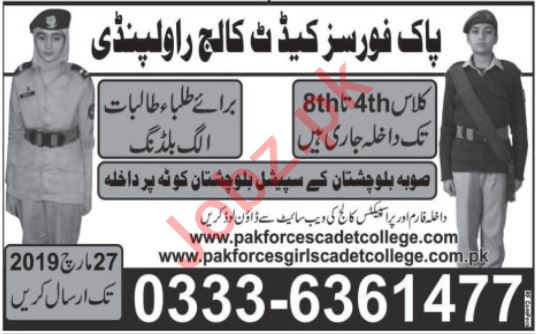 Pak Forces Cadet College Rawalpindi, Pakistan are started admissions spring 2019 for the classes of Class 4th to Class 8th. Last date of submission of application form 27th March 2019. Read newspaper ad for exact details.