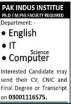 Vacancies in Pak Indus Institute Advertisement June 2022