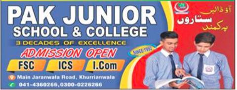 Pak Junior School & College Pre Medical, Pre Engineering, Computer Sciences admissions 2024 has been announced. Eligible students who qualify as per admission criteria in Pak Junior School & College Faisalabad Punjab Pakistan can apply in Teaching College for academic year 2024. Students for admissions in ICS, Intermediate and I.com & criteria can apply as per Private institute admission policy 2024 before closing date September 10, 2024 as per advertisement. Read newspaper ad for exact details.