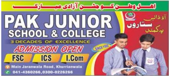Pak Junior School & College Fsc Pre Engineering, FSc Pre Medical, ICS Computer Science, I.Com admissions 2022 has been started. Eligible students who qualify as per admission criteria in Pak Junior School & College Faisalabad Punjab Pakistan can apply in Science College for academic year 2022. Students who want to enroll for academic session 2022 in Intermediate, I.com and ICS qualification and admission criteria for Private institute can apply till last date 14 September 2022. Read newspaper ad for exact details.