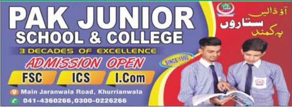 Admissions in Pak Junior School & College 2023 for Intermediate Part I, FSc Pre Medical , FSc Pre Engineering, ICS Computer Science, ICOM has been announced. Eligible students can apply for academic admissions 2023 in Pak Junior School & College Faisalabad Punjab Pakistan for Science College. Eligible candidates for admissions in Intermediate can apply as per Private institute criteria and before closing date 25 September 2023 after reading advertisement online. Read newspaper ad for exact details.