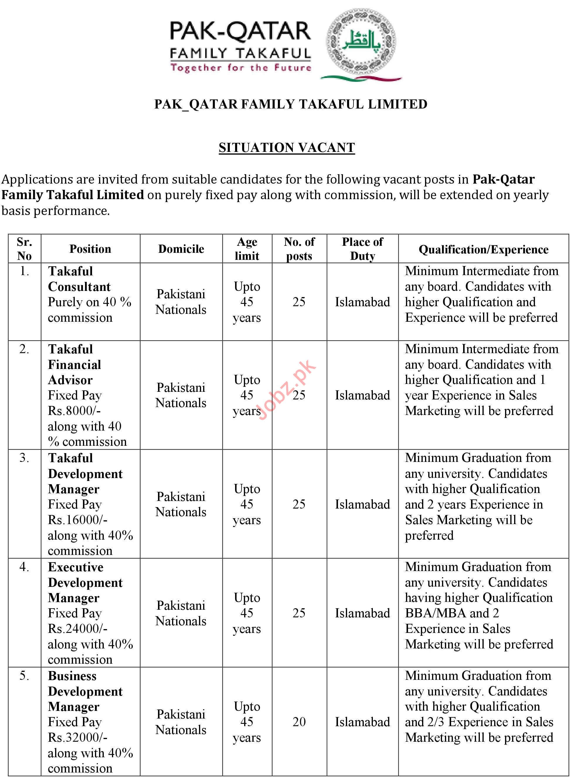 Vacancies in Pak Qatar Family Takaful Advertisement January 2020