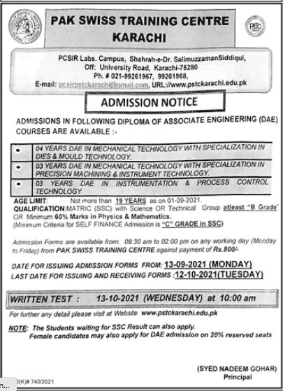 Pak Swiss Training Center has announced admissions of Diploma of Associate Engineering DAE & Courses in Mechanical Technology, Instrumentation & Process Control Technology. Read newspaper ad for exact details.