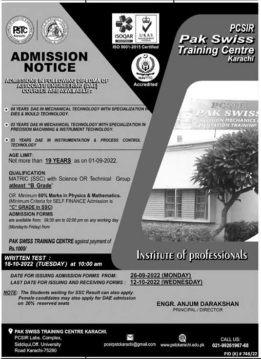 Admissions in Pak Swiss Training Center 2022 for DAE. has been announced. Pak Swiss Training Center Karachi Sindh Pakistan welcomes students to apply for admissions in academic year 2022 in Technical Diploma. Eligible candidates for admissions in DAE can apply as per Private institute criteria and before closing date 18 October 2022 after reading advertisement online. Read newspaper ad for exact details.