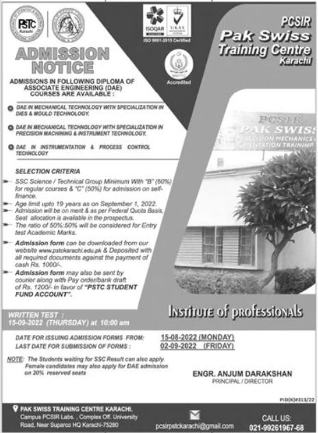 Admissions in Pak Swiss Training Center 2022 for Diploma of Associate Engineering DAE in Mechanical Technology with Specialization in Dies & Mould Technology, DAE Mechanical Technology with Specialization in Precision Machining & Instrument Technology, DAE in Instrument & Process Control Technology has been announced. Students who want to take admissions in Pak Swiss Training Center Karachi Sindh Pakistan for academic year 2022 to continue education in Technical Diploma can apply. Students for admissions in DAE can apply for online or campus classes as per Government institute criteria till admission closing date September 2, 2022. Read newspaper ad for exact details.