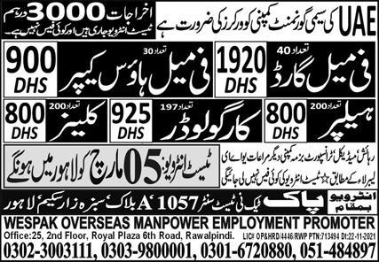 Pak Techni Test Center UAE, dubai UAE invites applications from eligible candidates for the post of cleaner, cargo loader, female guard, guard, helper and female house keeper as per advertisement of February 27, 2022 published in daily Express Newspaper. Preferred Education is Matric, Primary and Middle etc.