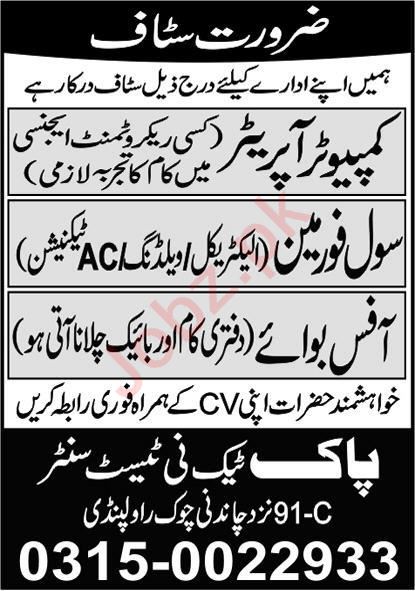 Vacant posts including office boy, computer operator and civil foreman are announced in Pak Techni Test Center Rawalpindi, rawalpindi Punjab Pakistan as per 17 September 2023 advertisement in daily Express Newspaper. Bachelor, Intermediate, Matric and DAE etc. educational qualification will be preferred.