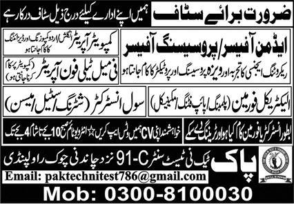 Pak Techni Test Center Rawalpindi, rawalpindi Punjab Pakistan invites applications from eligible candidates for the post of telephone operator, electrical foreman, admin officer, civil instructor, computer operator and visa processing officer as per advertisement of May 23, 2024 published in daily Express Newspaper. Intermediate, Matric, Bachelor, BA and DAE etc. educational qualification will be preferred.