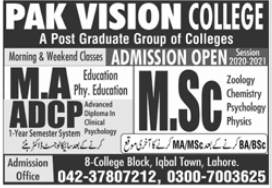 Pak Vision College A Post Graduate Group of Colleges has announced online admissions in MA Education, MA Physical Education, ADCP Advanced Diploma in Clinical Psychology, MSc Zoology, MSc Chemistry, MSc Psychology and MSc Physics in Lahore. Read newspaper ad for exact details.