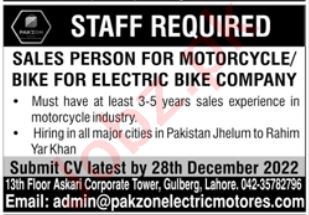 Pak Zonel Electronic Motors Lahore, lahore Punjab Pakistan invites applications from eligible candidates for the post of sales person as per advertisement of December 25, 2022 published in daily Jang Newspaper. Bachelor and Intermediate etc. educational qualification will be preferred.