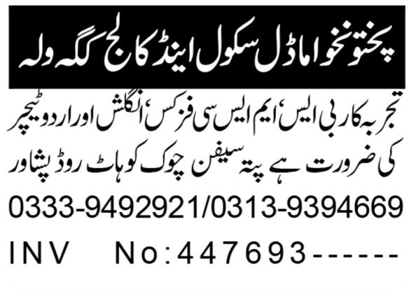 Pakhtunkhwa Model School jobs advertisement dated about 6 December 2025 in daily Aaj Newspaper invites application for the vacant post of english teacher, urdu teacher and physics teacher in Kohat Road Peshawar, peshawar Khyber Pakhtunkhwa KPK Pakistan. Preferred Education is M.sc, Bachelor and Master etc.